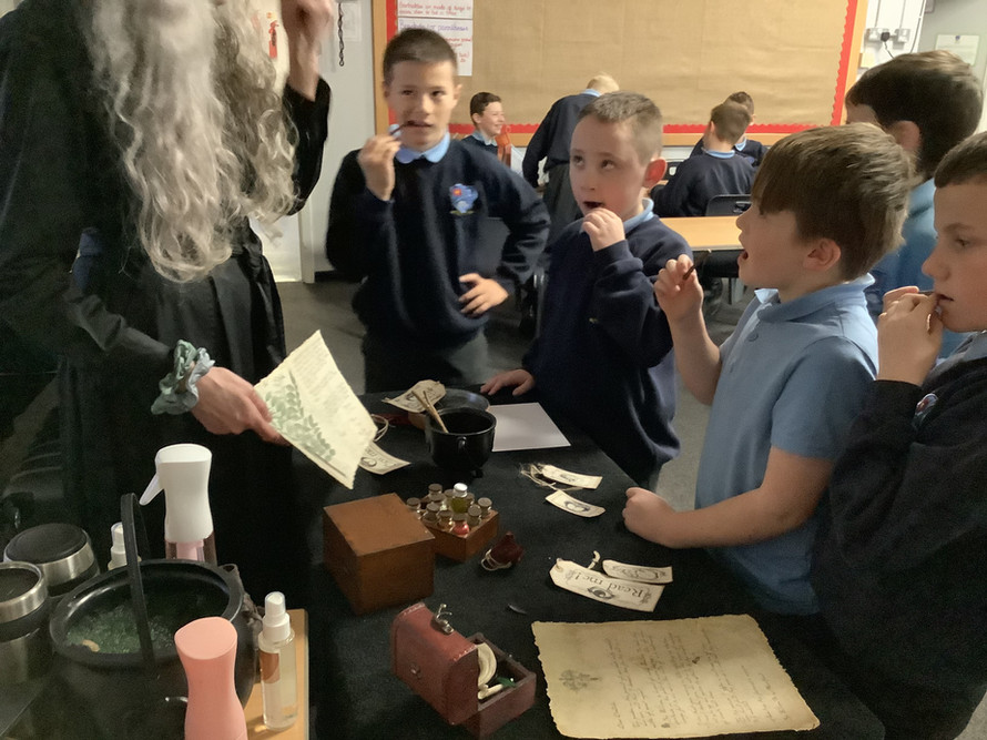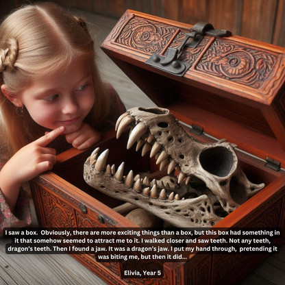 Dragonlore Children explore sensory-rich props to enhance their descriptive language skills and deepen their understanding of the 'show, not tell' creative writing technique. Whisked back in time to Demdike's cottage, they marvel at the iridescence of dragon scales, peer into a crystal ball, listen to witches' bells, and inhale the aromatic herbs of Demdike's Garden. Amidst these experiences, they taste liquorice root, turn the pages of ancient spell books, uncover the secrets of potion cupboards, and unlock a mysterious box containing the first baby tooth and claw of 'Our Kid', the dragon, a cherished keepsake.