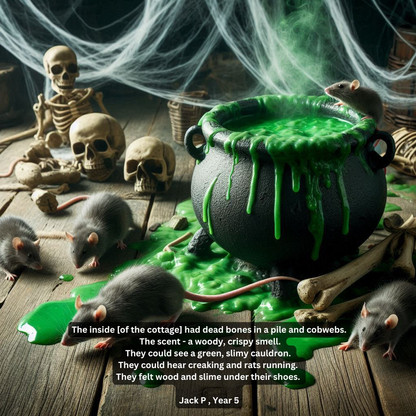 Reimagining Realms Whilst blindfolded, children embark on an immersive sensory journey into Demdike's world. Guided by Sophie's voice, audio cues, and scents, they are transported back four hundred years, experiencing the 'knights chase' over a rain-soaked Pendle Hill and finding sanctuary in Demdike's cottage. Through this experience, they fine-tune their senses and imagination, learning to create vivid narratives through sensory experience, thus enhancing their storytelling skills.
