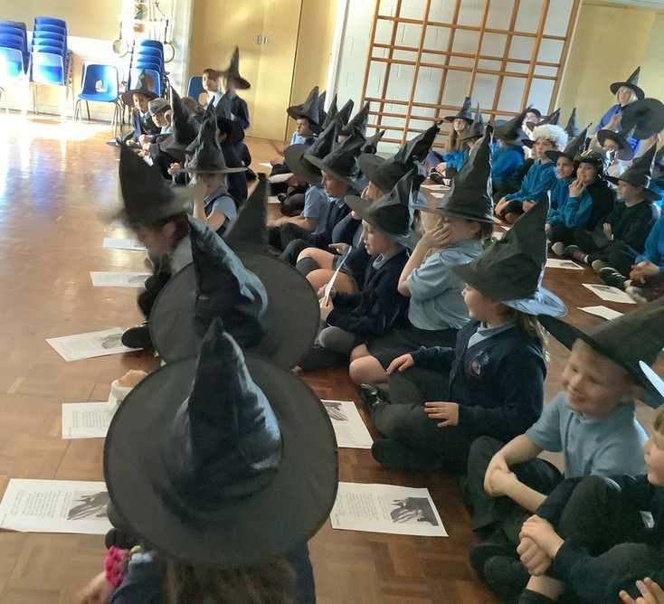 An author session with KS2 includes a highly interactive, immersive and creative reading of 'The Best Kept Secret', featuring magical props, music, a bubbling cauldron, a slime-covered baby dragon and costumes for all. It begins with an introduction to The Best-Kept Secret, followed by a brief exploration of folklore, legend and the history of the Lancashire witches. Every child actively engages in the storytelling process, with some embracing speaking roles while the rest join in as Demdike's trusty helpers, wearing witches' hats and conjuring up a dragon. And, of course, we must recognise the essential contribution of the whoopee cushion orchestra...